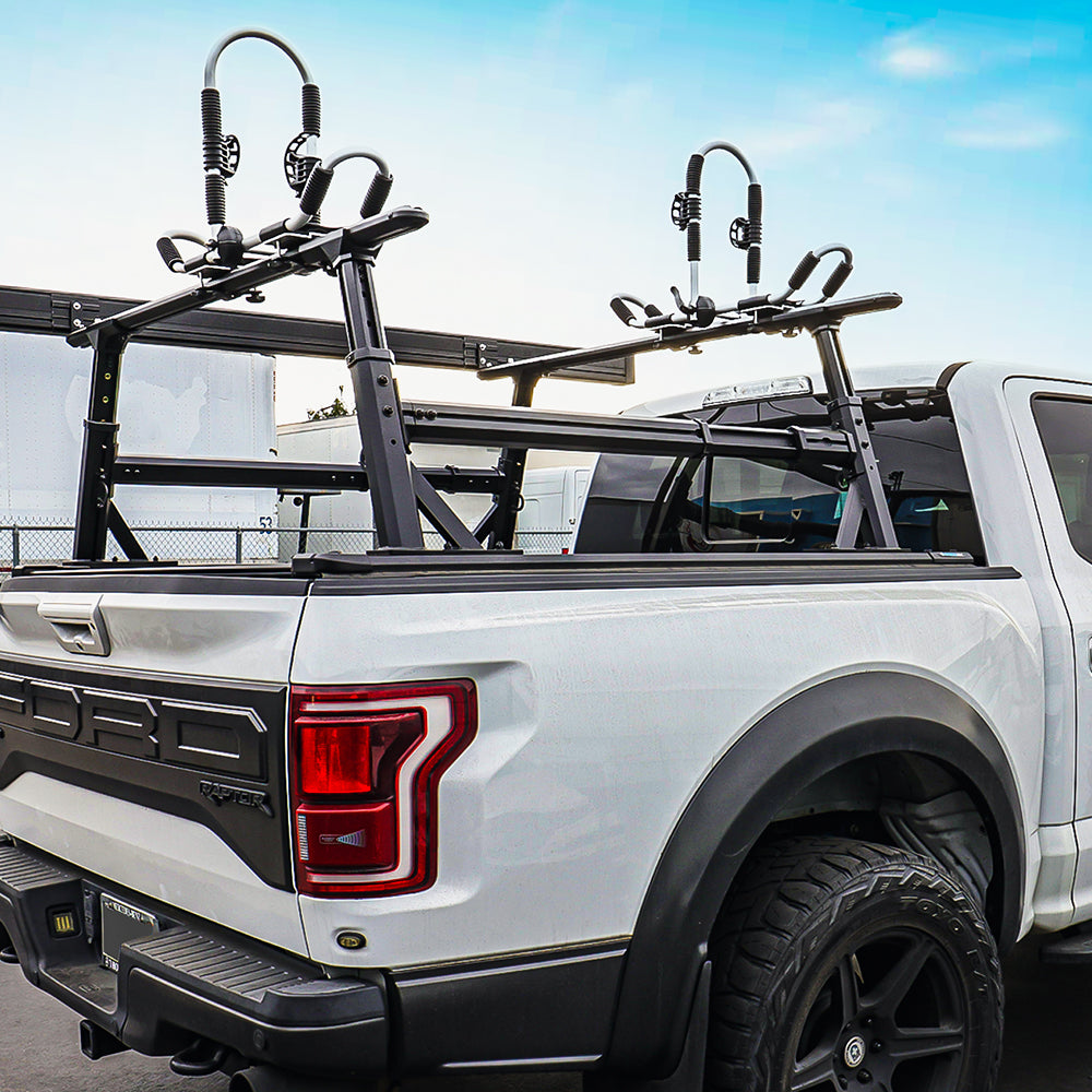A rack system dramatically expands your vehicle’s versatility—allowing safe, organized transport of bikes, kayaks, rooftop tents, ladders, work gear, and cargo boxes above the truck bed, while keeping valuable equipment protected below with a tonneau cover.